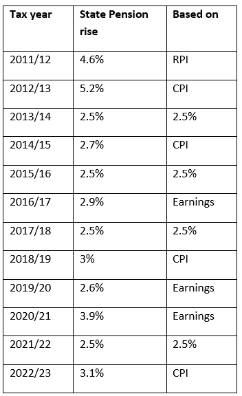 The government introduced the triple lock in the 2011/12 tax year, and, so far, the highest annual increase is 5.2%. The table below shows how the State Pension has increased each tax year.
